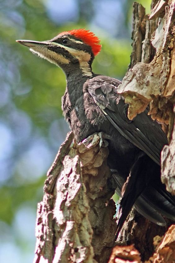 Native to the forests of North America, Pileated Woodpeckers prefer mature woodlands with abundant dead or dying trees, which provide both food and nesting sites. They are generally solitary creatures, with each woodpecker maintaining its own territory. Most active during the early morning and late afternoon, they spend much of their time foraging for food and drumming on trees to communicate and establish territory.